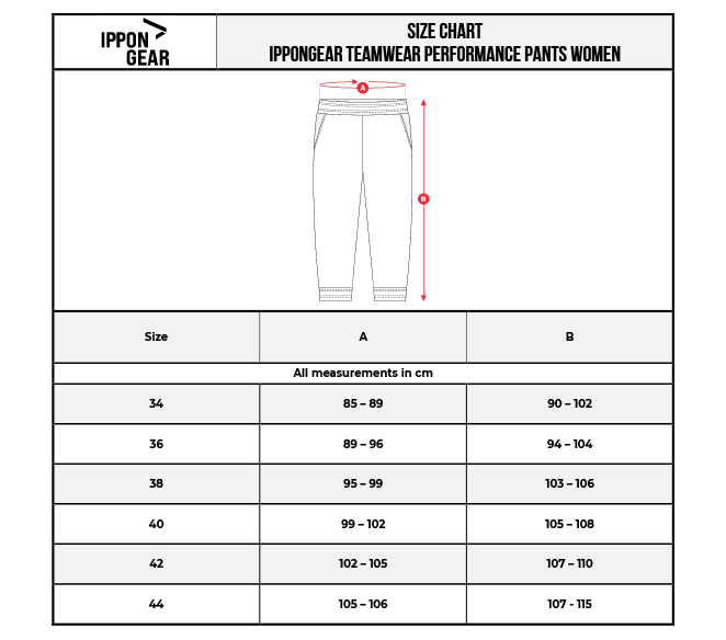 Größentabelle IPPONGEAR TRAININGSHOSE PERFORMANCE WOMEN